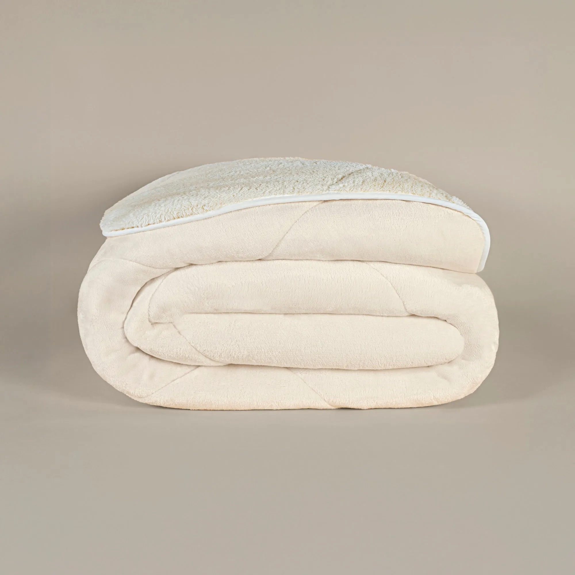Cobertor invernal con primera vista de textura suave Beauty Soft y su segunda vista de borrega premium.