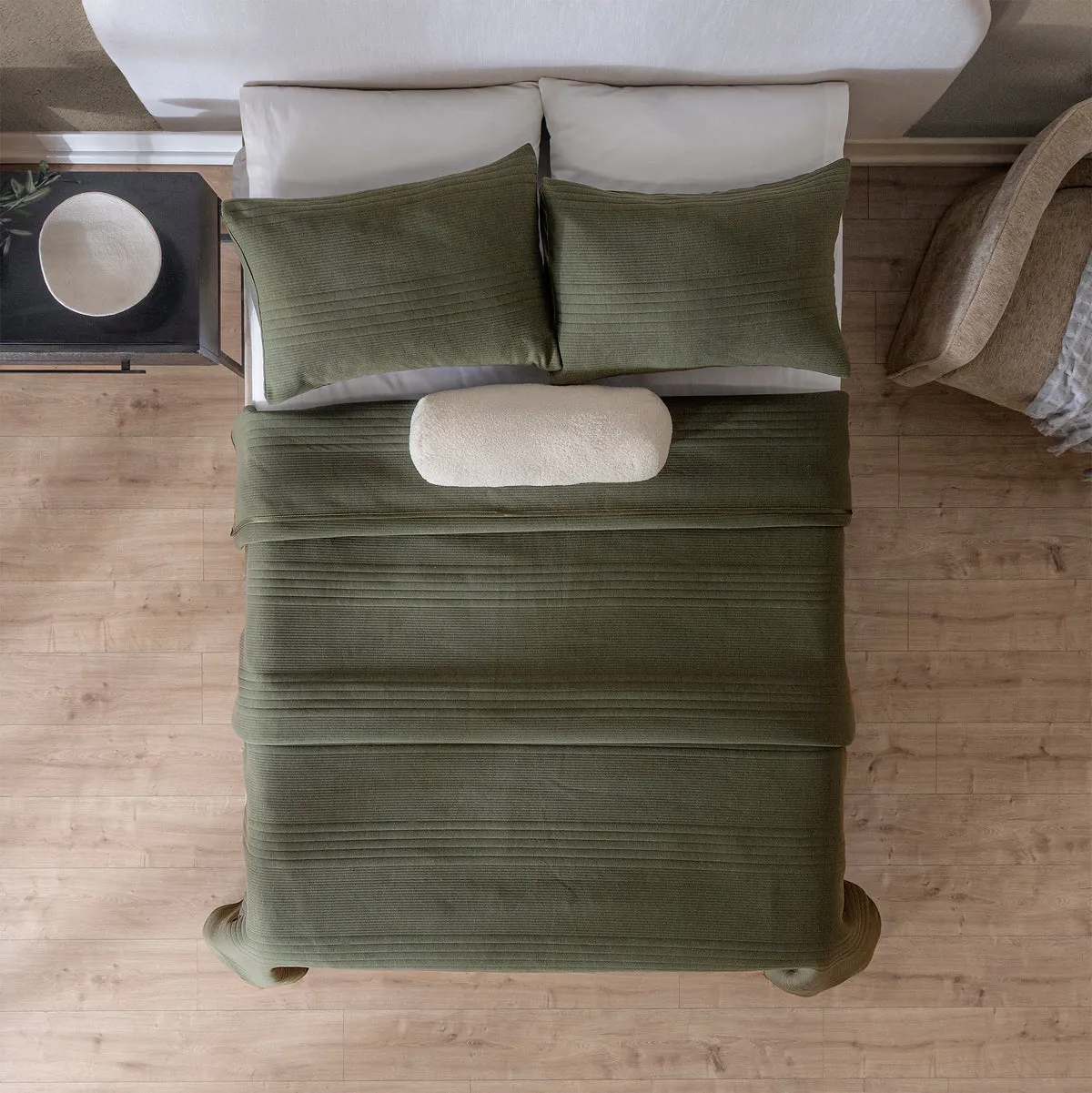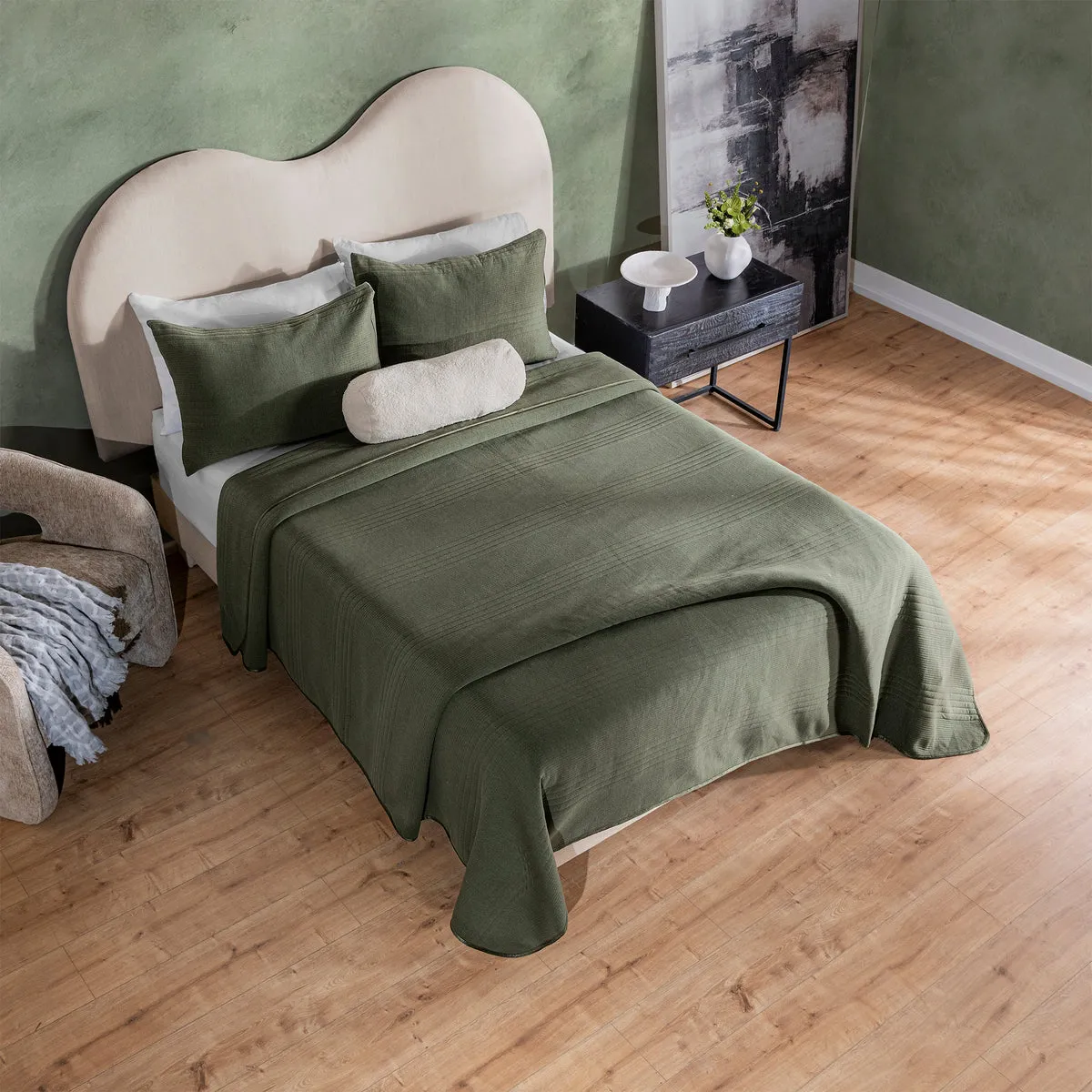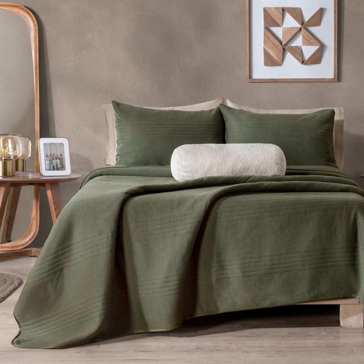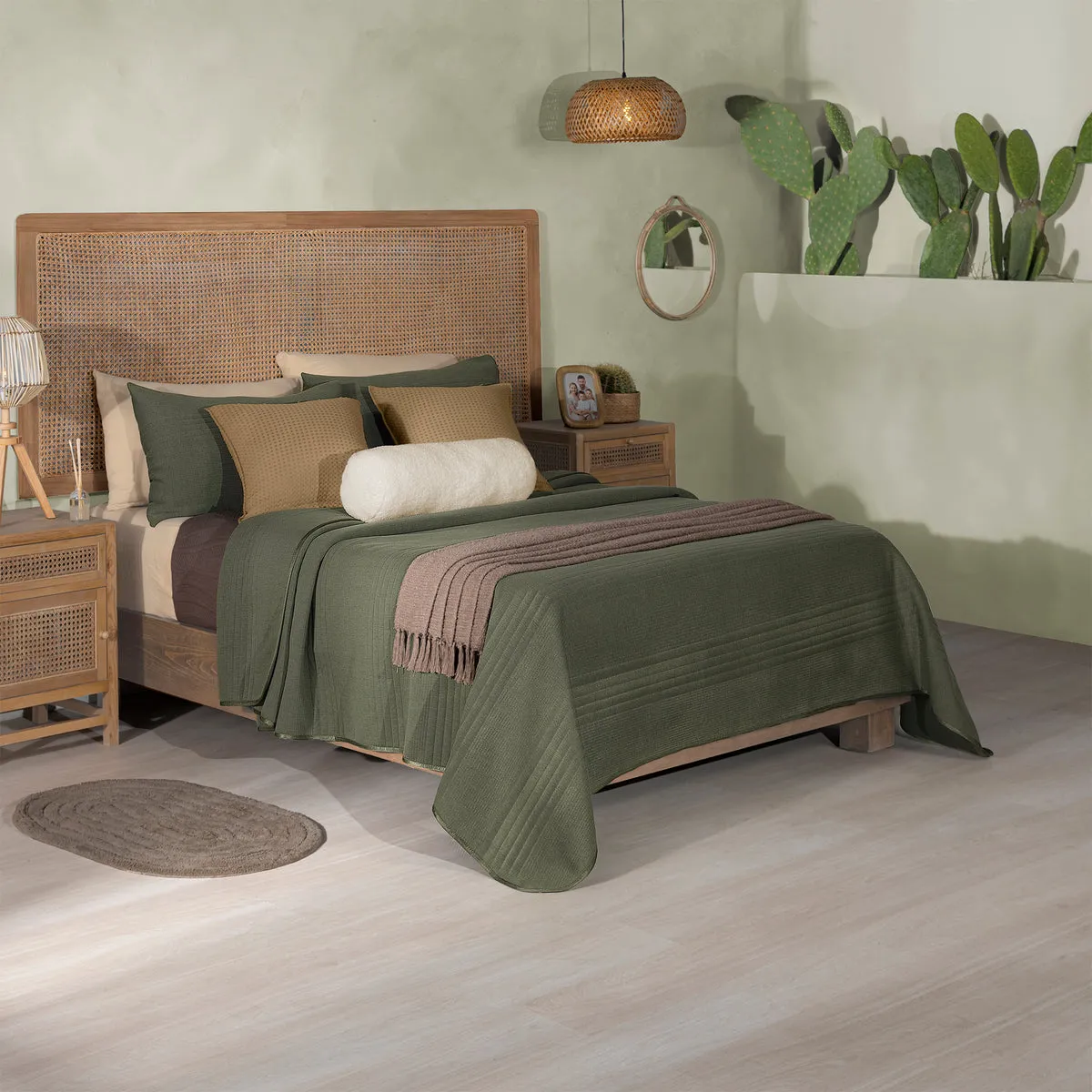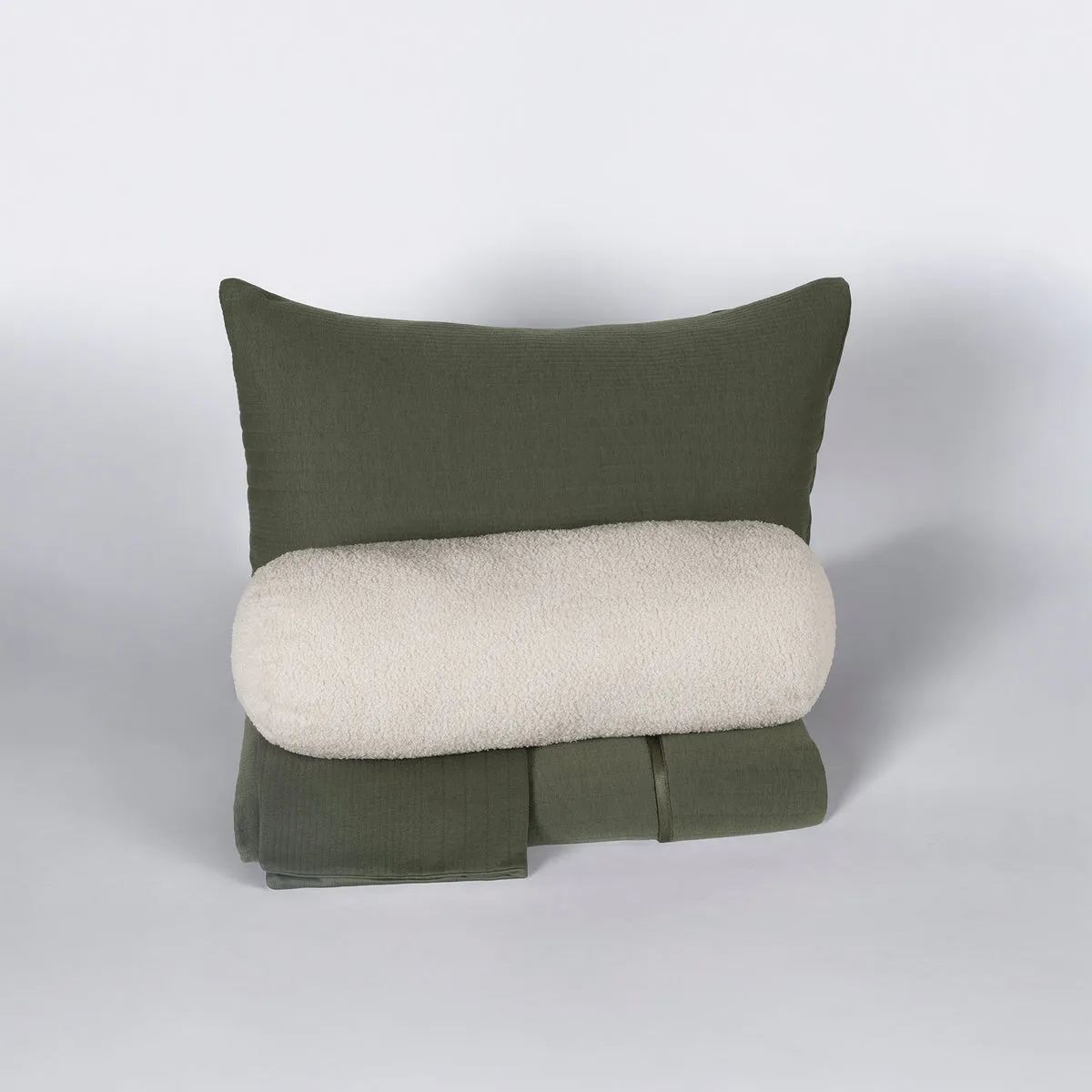-Tela jersey. -Capitonado con hilo. -Incluye fundas de almohada europeas. -Incluye cojín cilindro bucle.